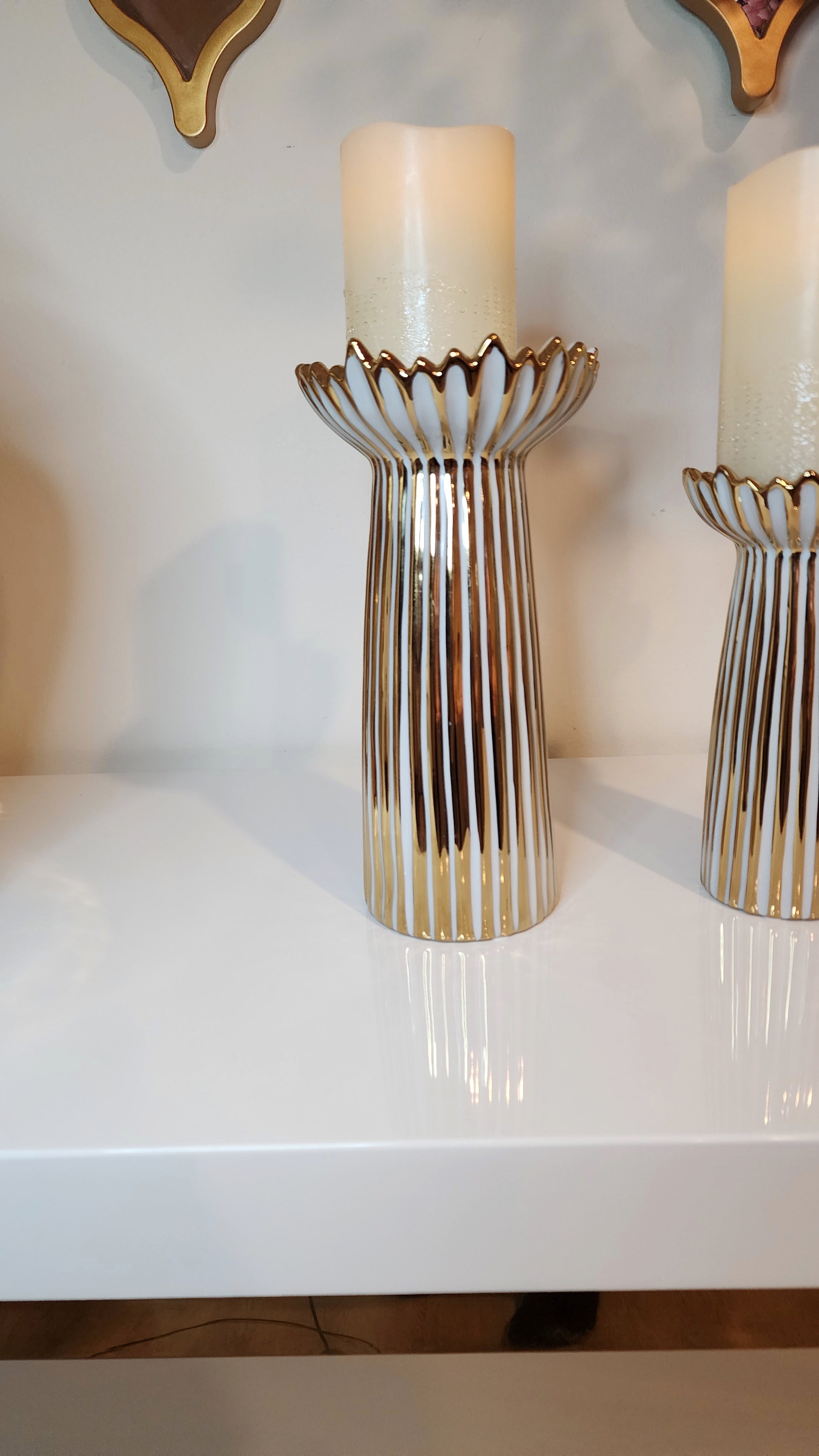 Created from high-quality ceramic, these candle holders feature a beautiful white and gold finish that adds a touch of sophistication to any space.